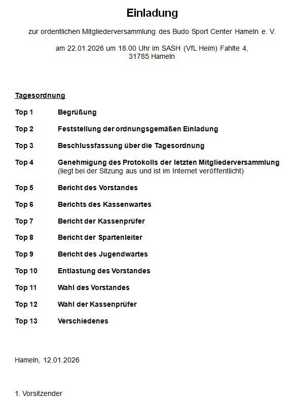 Die nächste Mitgliederversammlung des Budo Sport Center Hameln wird am 22.01.2026 im SASH stattinden!